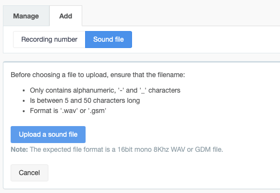 First, upload your greeting message to the IVR Recordings page. Audio files must be in the following format: .wav 8KHz mono 16bit