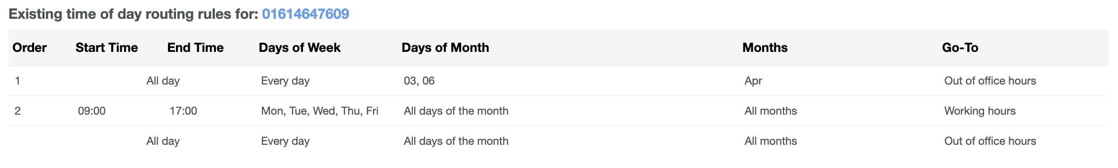 | Calls in time range go to | Out of Office Hours |