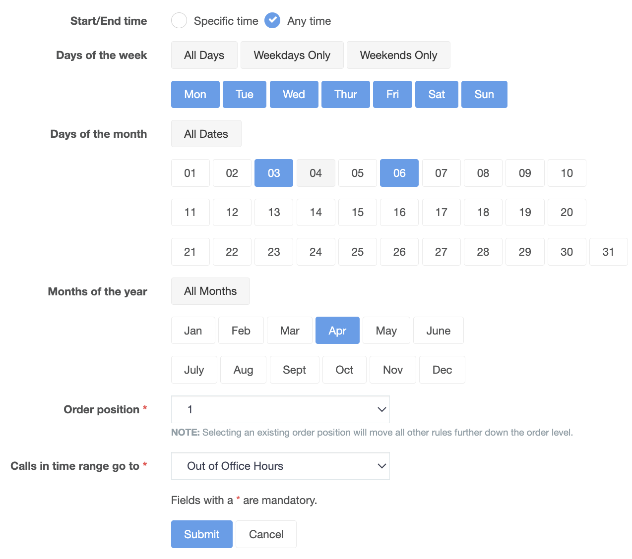 Here is what your Add A New Time of Day Routing Rule form should look like: