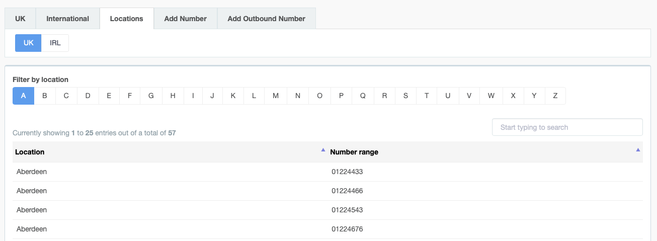 Use this option to view UK and Ireland locations and number ranges that can be added to your account. Select either UK or IRL locations, and then select from the A to Z toolbar to narrow your selection.