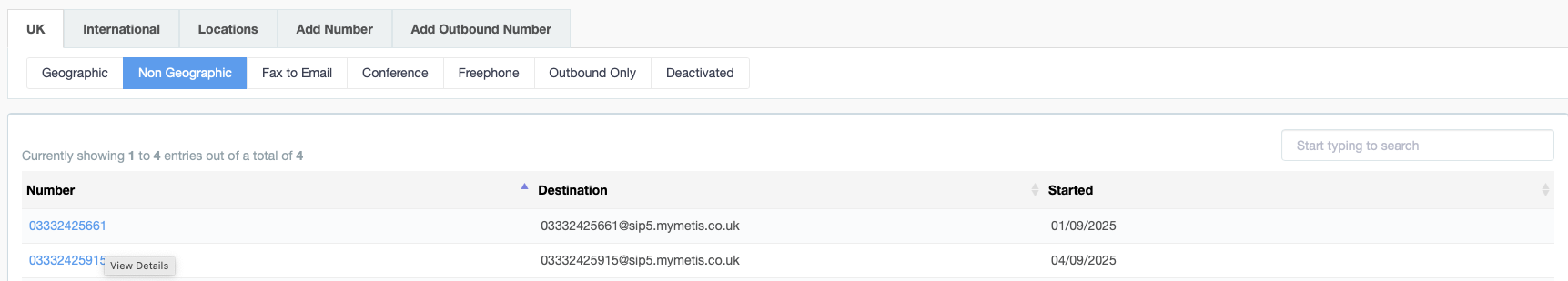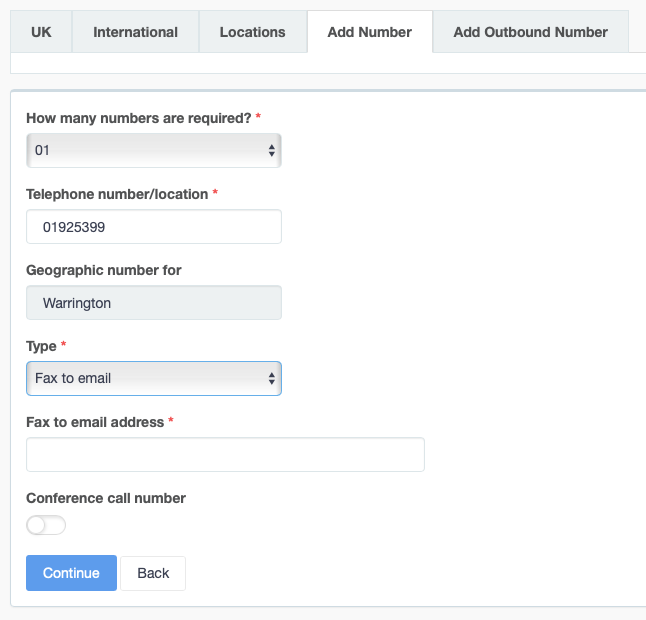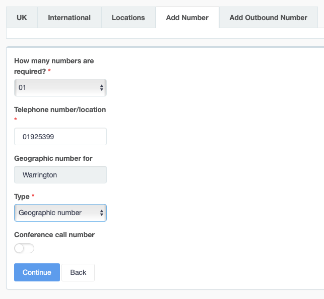 To add a number and associate a conference service, repeat the initial process and choose the type 'geographic'. Next, tick the conference call number option and entry a four-digit conference PIN. The conference number pin will be used to access the conference service for users dialling the number.