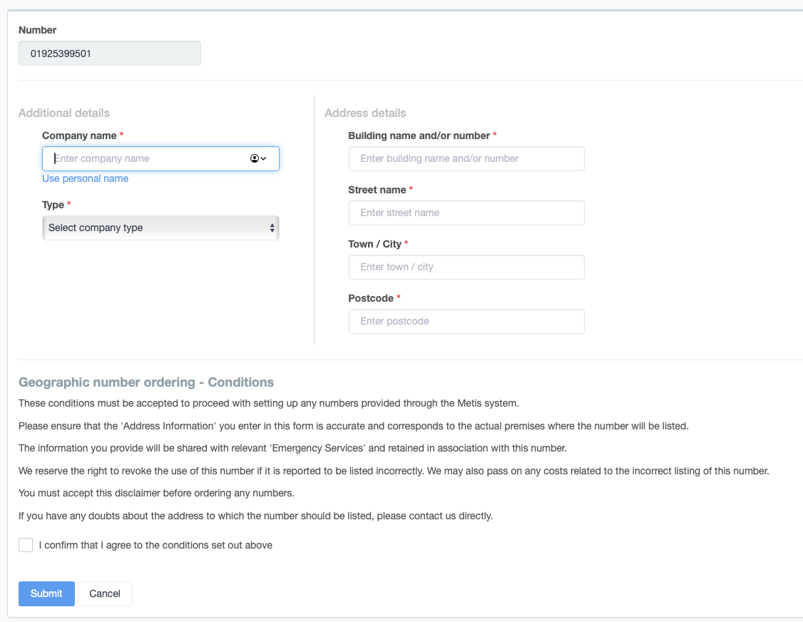 On the final screen, enter your address information and tick to accept the terms and conditions. The address information is added to the UK emergency services, number and address database. This information is a mandatory requirement for all numbers added via Metis.