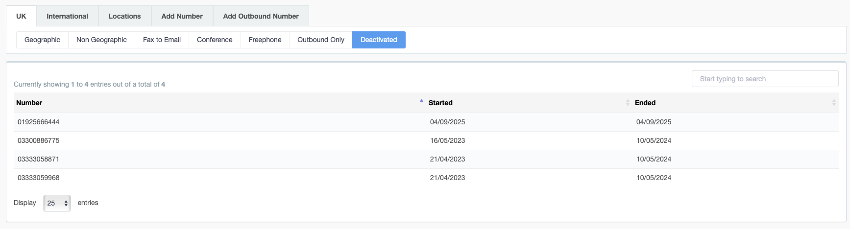 All deactivated numbers can be seen in the Deactivated numbers tab.
